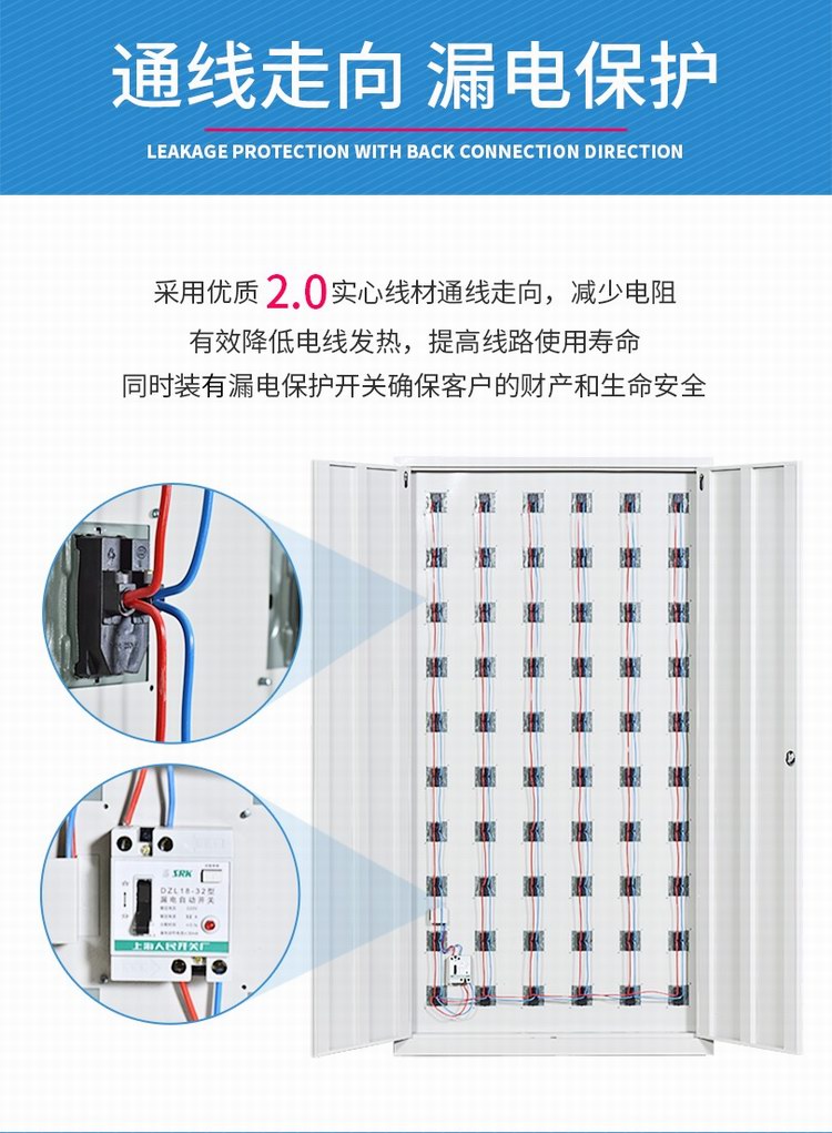 电源线全部采用2.5mm2实心线材,额定电压为标准生活电压220V,载荷电流为20A,负载功率为4400W。日常用手机充电功率为10-15W左右,可满足290部(按15W计算)手机同时充电,而本手机柜可达到门数为100门,电源线材远远满足充电需求;同时具有漏电?;すδ?,当发生漏电时,能够及时将电源切断,保护充电设备安全,需手动复位方可通电,防止因漏电造成电子设备损坏。