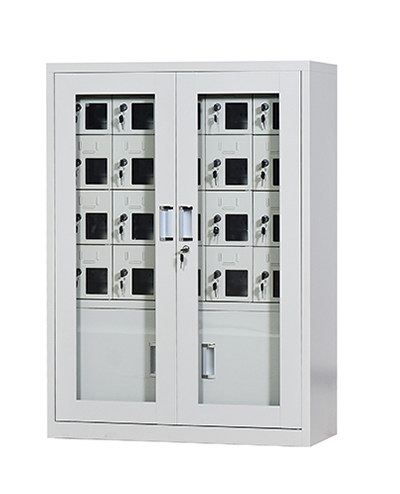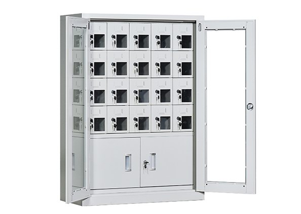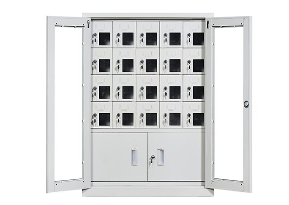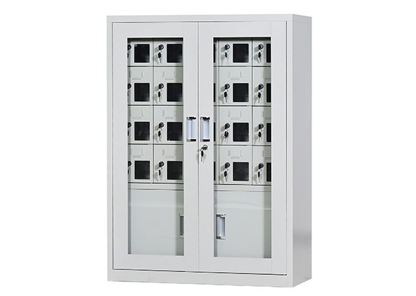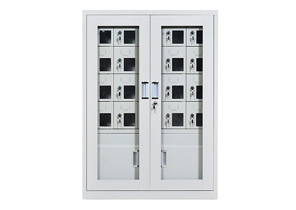 手机保密柜正面为对开金属边框玻璃大门,便于观察柜内情况,坚固透亮,美观大方。