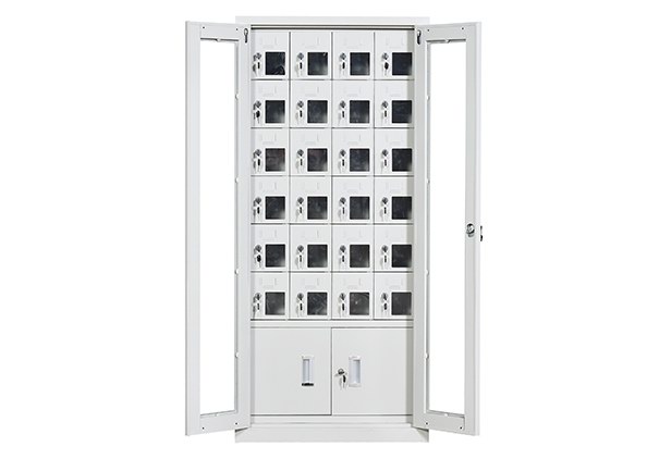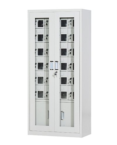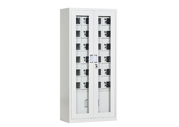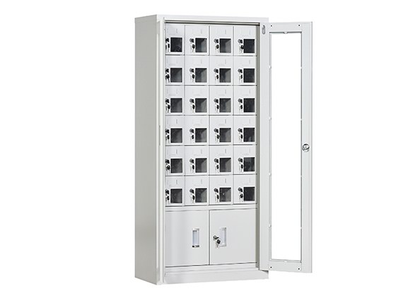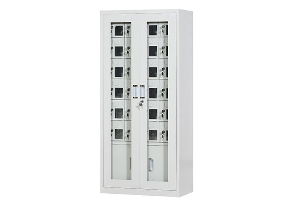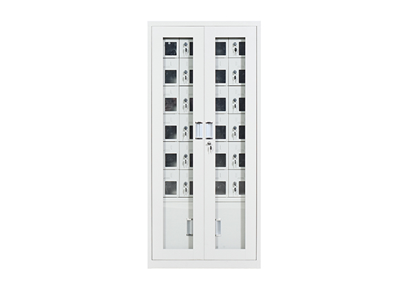 手机保密柜正面为对开金属边框玻璃大门,便于观察柜内情况,坚固透亮,美观大方。
